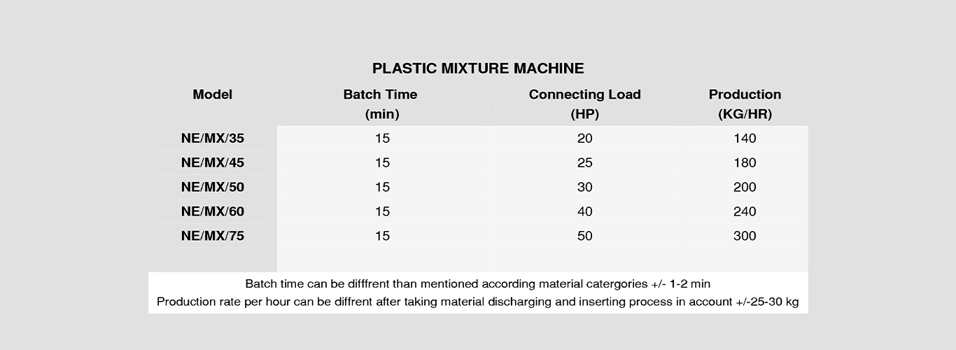 In the entire process, A plastic material, normally in flakes form or granules form is loaded into drum along Master batch, pigment or additive, usually made from fabricated from mild steel inside and out or fabricated from mild steel on outside and stainless steel on inside as per material requirement. There is mild steel / stainless steel rotor fitted on the shaft on center of the drum. Where’s heavy duty bearing housing provided for the shafting of mixture machine. AC motor is connected with shafting with pulleys and belts. Rotor rotates at high RPM. Where raw material and additives starts to mix with each other and due to friction raw material gets warm up around 70-80 degrees. Warmed raw material makes extruder job effortless. Batch size depends on the drum storage capacity of mixture machine where batch timings are around 10-15 min. After cycle completes, finished raw material is discharged from the output mouth of the drum.