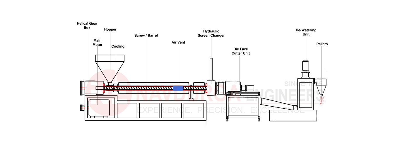 In the entire process, A plastic material, normally in flakes form is placed into hopper of extruder, usually made from fabricated from mild steel or fabricated from stainless steel as per material requirement. There is a hopper magnet fitted inside the hopper to stop metallic particles from entering inside the barrel. The raw material in the form of flakes, is gravity fed into the hopper and through the feed throat, drop on the rotating screw. Barrel has a air vent for degassing the material and machine contains the AC frequency drives to adjust the motor rpm. Barrel has several amount of heaters fitted on the outer diameter. Which heats up the barrel to get extrusion process job done. Screw is connected with helical gearbox and AC motor which helps to rotate the screw. Raw material in flakes form starts to move forward along the rotating screw and enters the heating spot of barrel. Where it starts to melt. Molten plastic reaches the end of the barrel where hydraulic screen changer is fitted which filters the molten plastic and leads it to the die face cutting unit where sharp blade is rotating on high rpm on face of outer side backer plate of the screen changer. This blades cuts the molten plastic into round shaped pellets. Entire cutting process occurs In presence of constant water circulation. Finished pellets travels to the de watering unit along water flow. In de watering unit, pellets get completely dry and travels to the storage silo with the help of hot air blower.