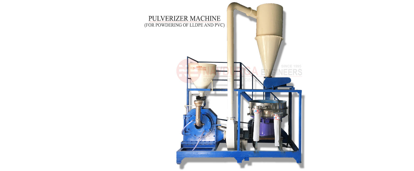 In the entire process, A plastic material can be in granules form (for lldpe) or in flakes form (for pvc) is placed inside the hopper of pulverizer machine, the raw material starts to feed inside the housing of the pulverizer machine. The housing contains one set of blade, which blade is made of special material which gets the job done. Plastic granules enter in the housing and collected in the center of the grinding disc. It is then pushed outwards by the centrifugal force between stator and rotary disc. Powder form of the material comes out of the housing with the help of blower which cools powder intensively and enters in the vibro shifter. Vibro shifter differentiate the powder uniformly and separate the unsuccessful grinded particles into different container which can be used for regrinding.