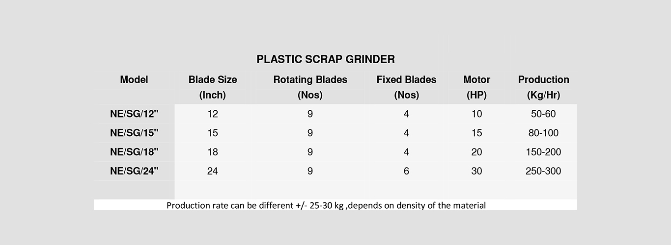 Our Scrap Grinder Models Range has production from 50kg/hr to 300 kg/hr.